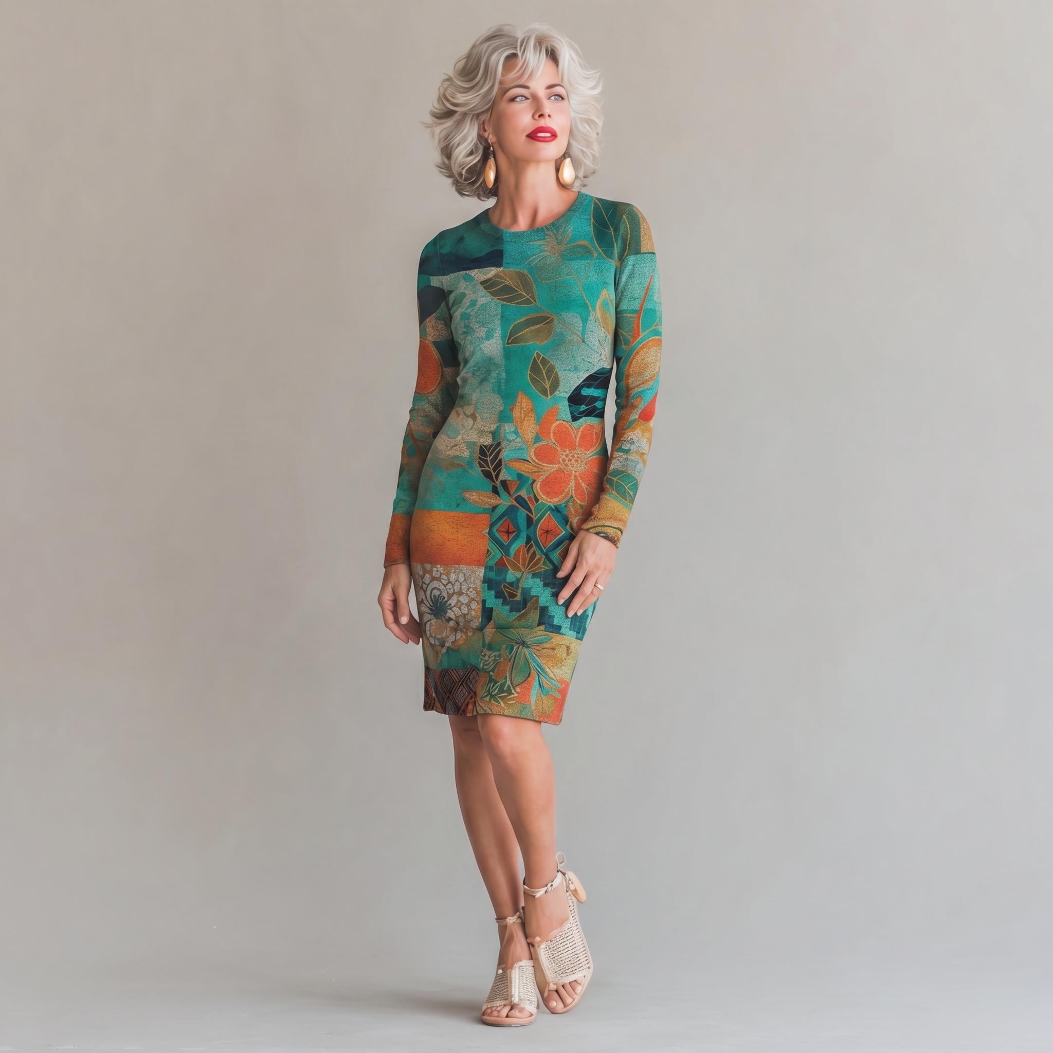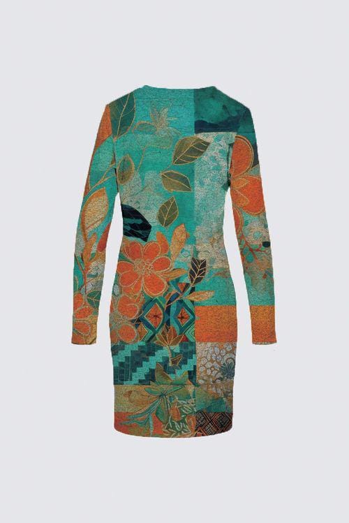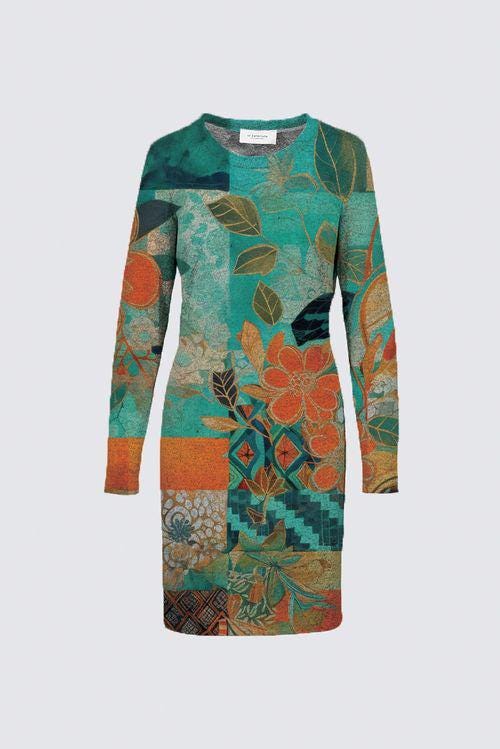 Azul Mosaic Sophia Dress: Long Sleeve Teal Floral Sweater Knit Straight Fit