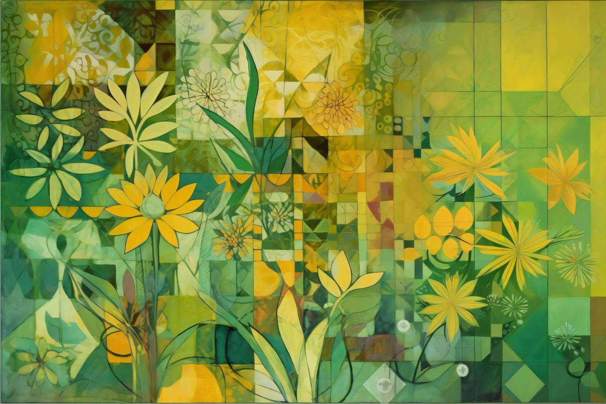 The Golden Light Garden Mosaic artwork blends sunlit yellows with rich botanical greens and abstract geometric layering, creating a serene yet visually captivating design. It’s a piece that feels calm, grounded, and quietly striking.