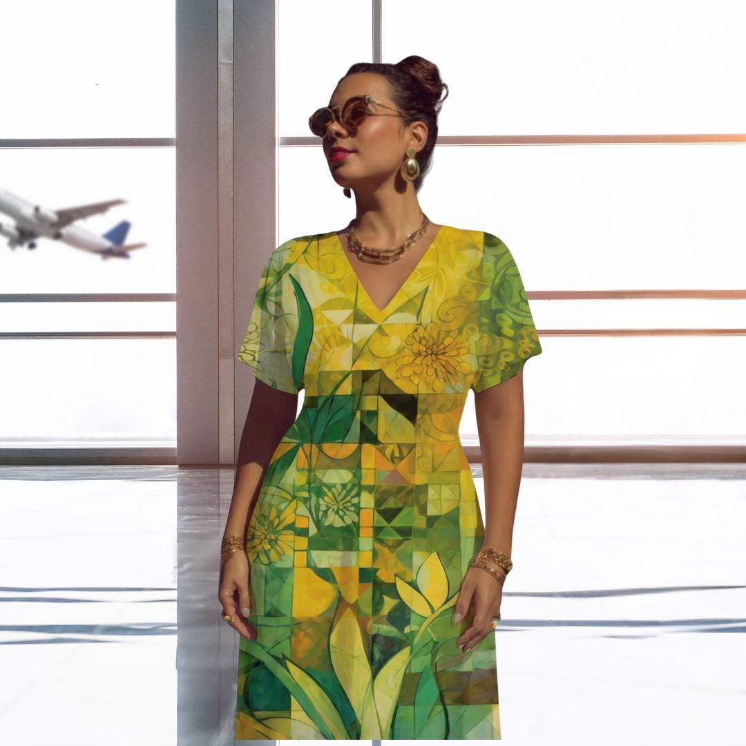 With a softly draped V-neckline and relaxed silhouette, this dress offers comfort without sacrificing sophistication. The flowing shape allows for natural movement, making it perfect for warm days, travel, or simply feeling beautiful with ease.