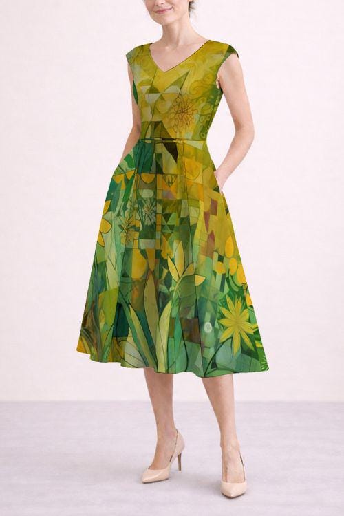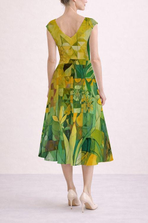 Elegant, feminine, and effortlessly refined — the Golden Solstice V-Neck Fit & Flare Midi Dress is designed to move beautifully with you.
